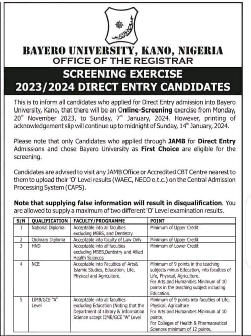 BAYERO UNIVERSITY, KANO (BUK) ANNOUNCES SALES OF POST UTME AND DE ADMISSION FORM FOR THE 2023/2024 ACADEMIC SESSION