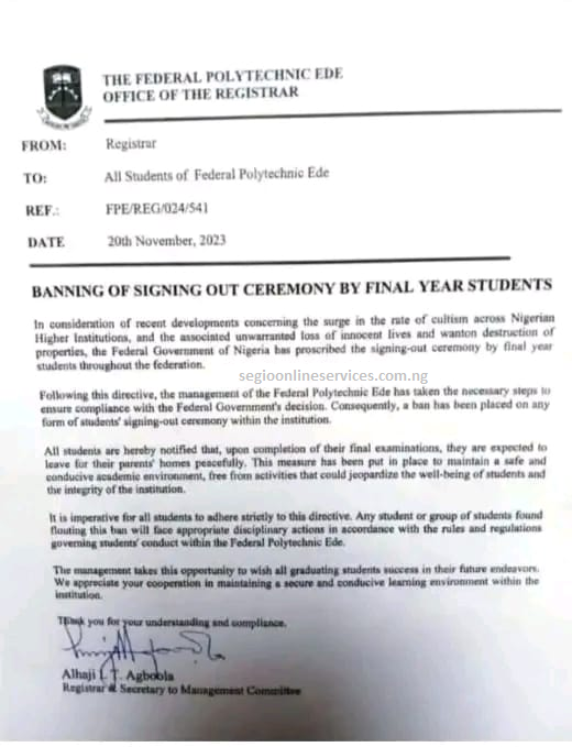 In, consideration of recent developments concerning surge in the rate of cultism across Nigerian Higher Institutions, and the associated unwarranted loss of innocent lives and wanton destruction of properties, the federal Government of Nigeria has proscribed the signing-out ceremony by final year students throughput the federation.