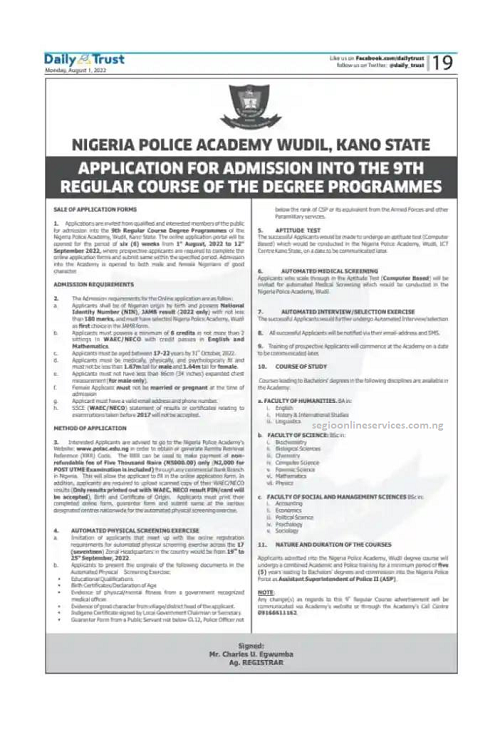 NIGERIA POLICE ACADEMY, WUDIL (NPA) ANNOUNCE SALES OF ADMISSION FORM INTO DEGREE PROGRAMME FOR THE 2022/2023 ACADEMIC SESSION