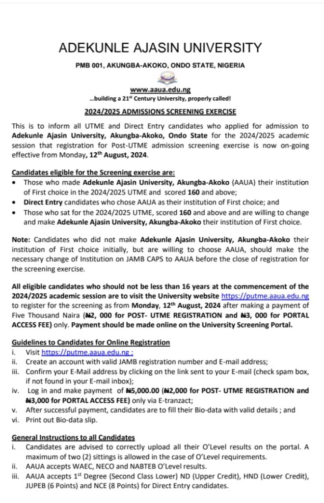 ADEKUNLE AJASIN UNIVERSITY AKUNGBA-AKOKO (AAUA) ANNOUNCES 13TH CONVOCATION CEREMONY JOIN THE SEGIO ONLINE SERVICES OFFICIAL NEWSROOM AND STAY UPDATED REAL-TIME WITH VERFIED EDUCATIONAL NEWS