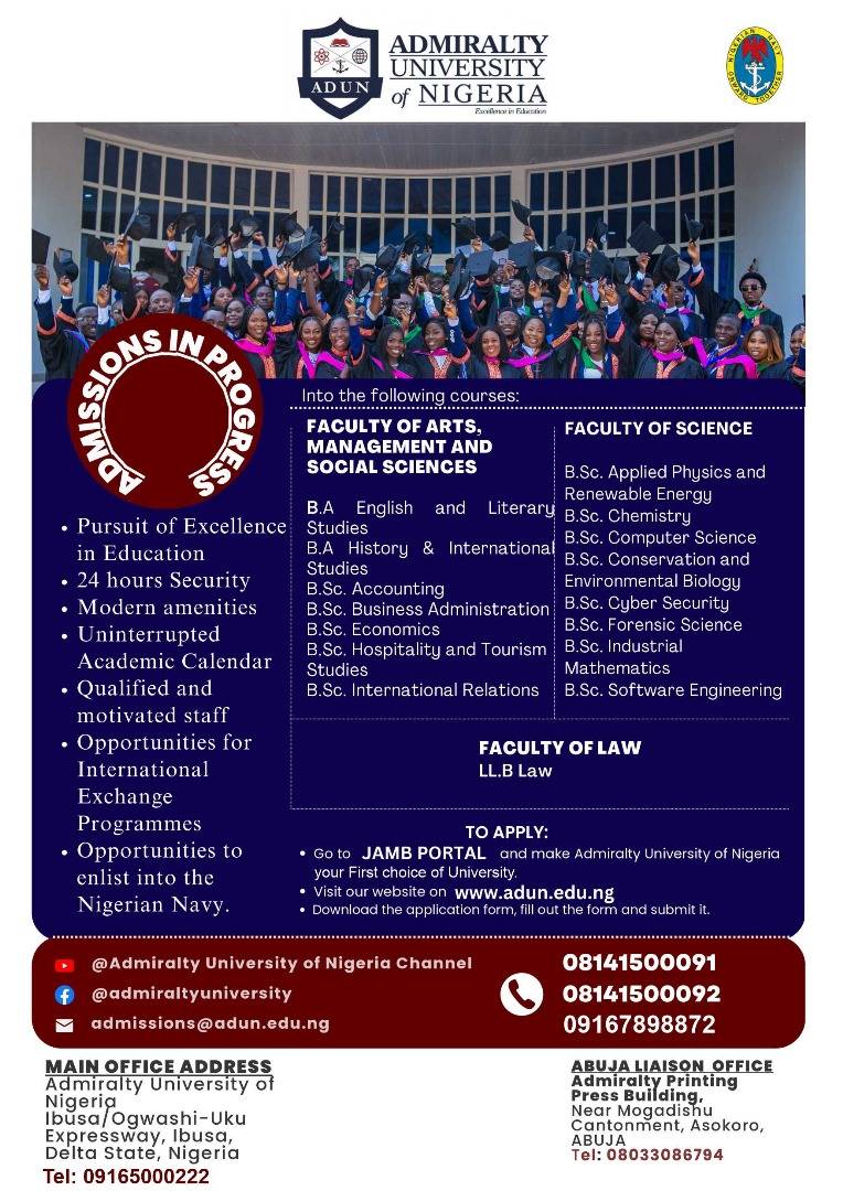 ADMIRALTY UNIVERSITY OF NIGERIA (ADUN) RELEASES POST-UTME ADMISSION FORM FOR THE 2024/2025 ACADEMIC SESSION