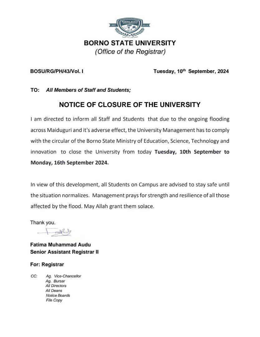 I am directed to inform all Staff and Students that due to the ongoing flooding across Maiduguri and it’s adverse effect, the University Management has to comply with the circular of the Borno State Ministry of Education, Science, Technology and innovation to close the University from today Tuesday, 10th September to Monday, 16th September 2024.