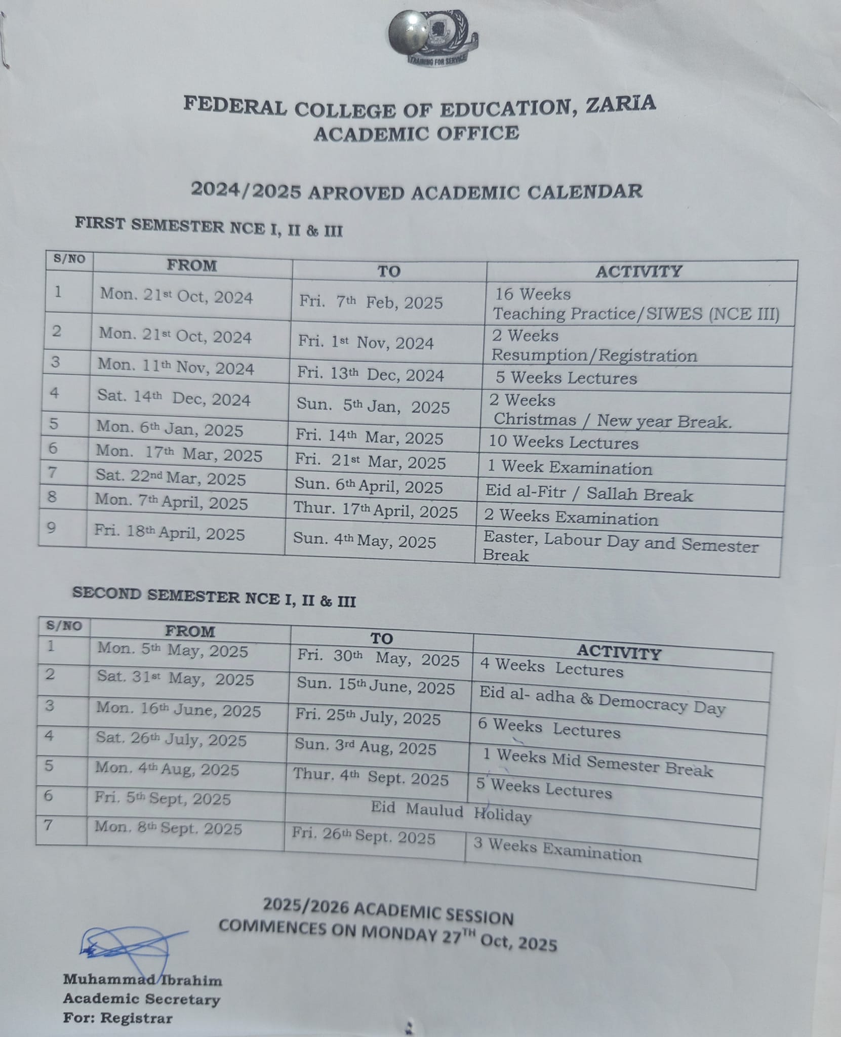 FEDERAL COLLEGE OF EDUCATION ZARIA (FCE-ZARIA) RELEASES APPROVED NCE-REGULAR ACADEMIC CALENDAR FOR THE 2024/2025 ACADEMIC SESSION