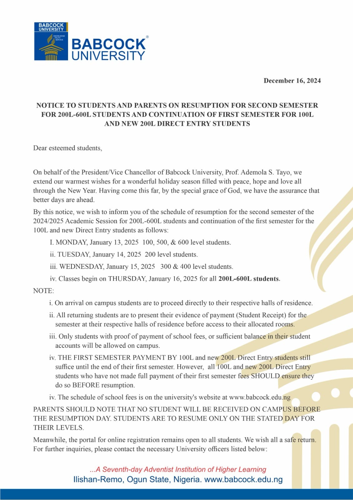 NOTICE TO STUDENTS AND PARENTS ON RESUMPTION FOR SECOND SEMESTER FOR 200L-600L STUDENTS AND CONTINUATION OF FIRST SEMESTER FOR 100L AND NEW 200L DIRECT ENTRY STUDENTS