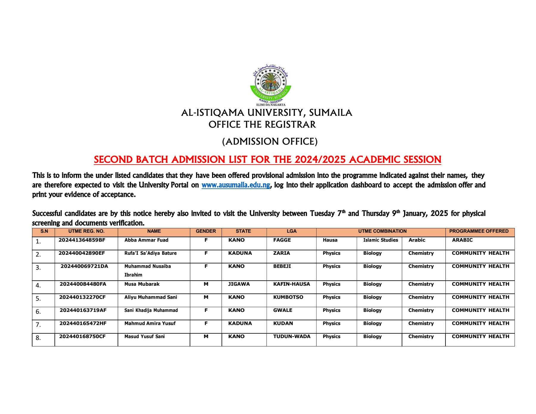This is to inform the general public and prospective candidates who applied for admission into the AL-ISTIQAMA UNIVERSITY, that the management of the institution has released Second Batch Admission List for the 2024/2025 academic session.