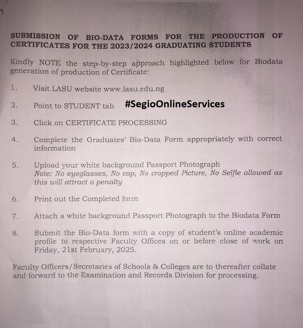 LASU announces Submission of Bio-Data Forms for the Production of Certificates for the 2023/2024 Graduating Students