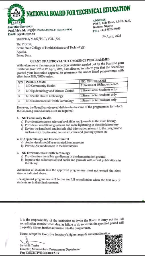BENUE STATE COLLEGE OF HEALTH TECHNOLOGY AGASHA (BSCHTA) SECURES NBTE ACCREDITATION FOR 4 NEW ACADEMIC PROGRAMMES