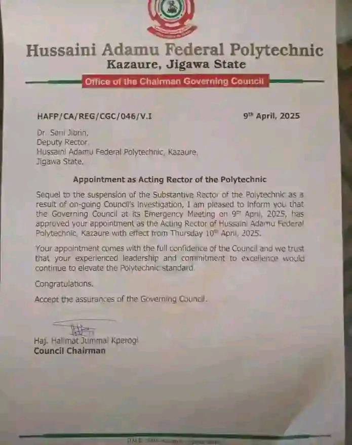 The Governing Council of Hussaini Adamu Federal Polytechnic Kazaure, Jigawa State, has appointed Dr. Sani Jibrin as the Acting Rector of the institution. This decision was made at an emergency meeting on April 9, 2025, and takes effect from April 10, 2025.