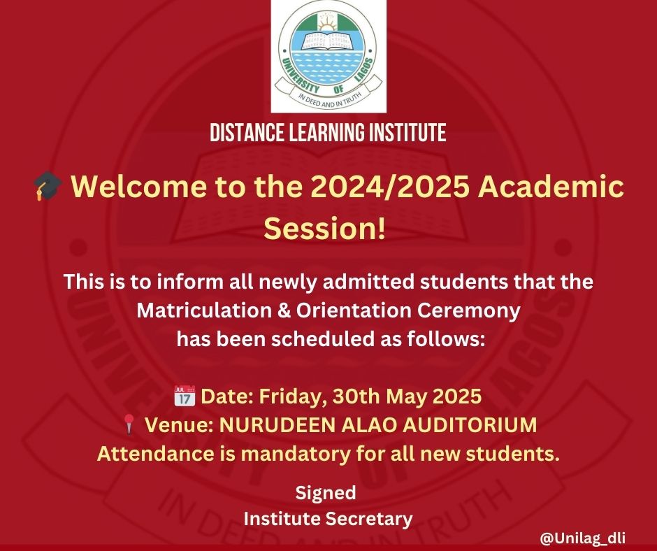 The Distance Learning Institute (DLI) of the University of Lagos has announced the schedule for its matriculation and orientation ceremony for newly admitted students of the 2024/2025 academic session.