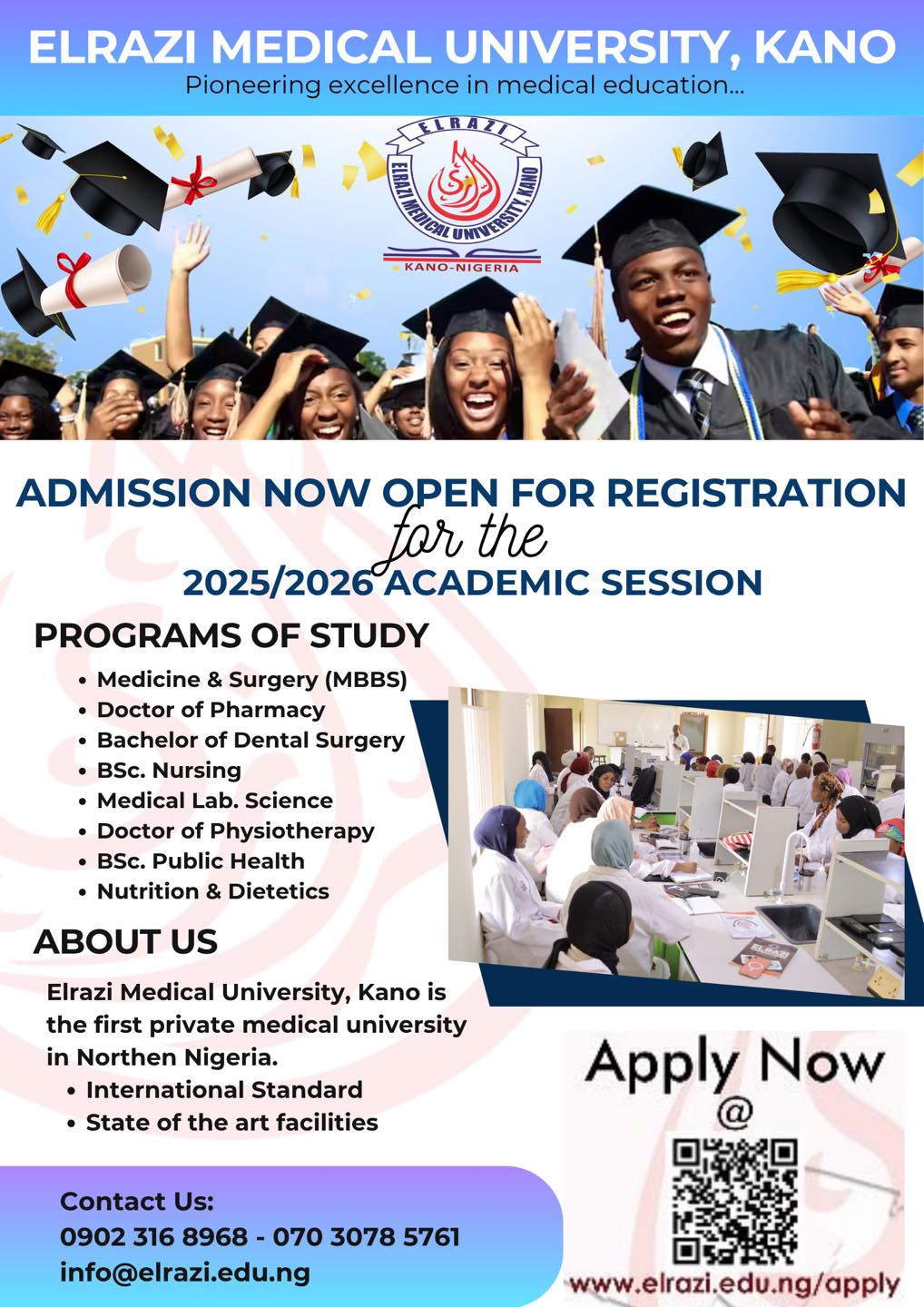 Elrazi Medical University, Kano, has announced the commencement of its admission exercise for the 2025/2026 academic session. The announcement was made through an official release by the institution, inviting applications from qualified candidates across the country.
