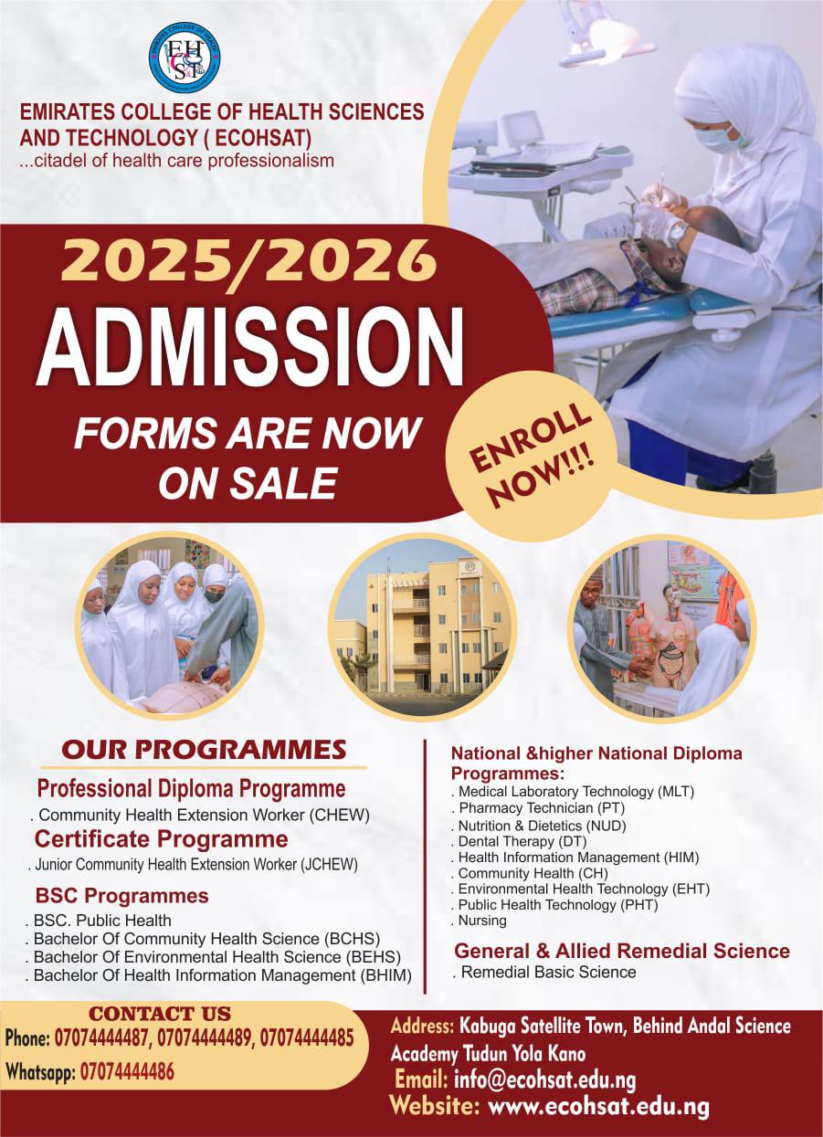 The management of Emirates College of Health Sciences and Technology (ECOHSAT), Kabuga Satellite Town, Kano, has officially announced the commencement of its 2025/2026 academic session admission exercise. The institution, widely known as a citadel of healthcare professionalism, has thrown open its gates to prospective students looking to pursue careers in various health-related fields.