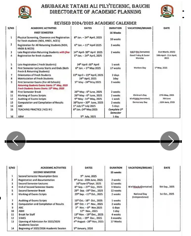 The managements of ABUBAKAR TATARI ALI POLYTECHNIC (ATAP) has released the revised approved Academic Calendar for the 2024/2025 Academic Session.