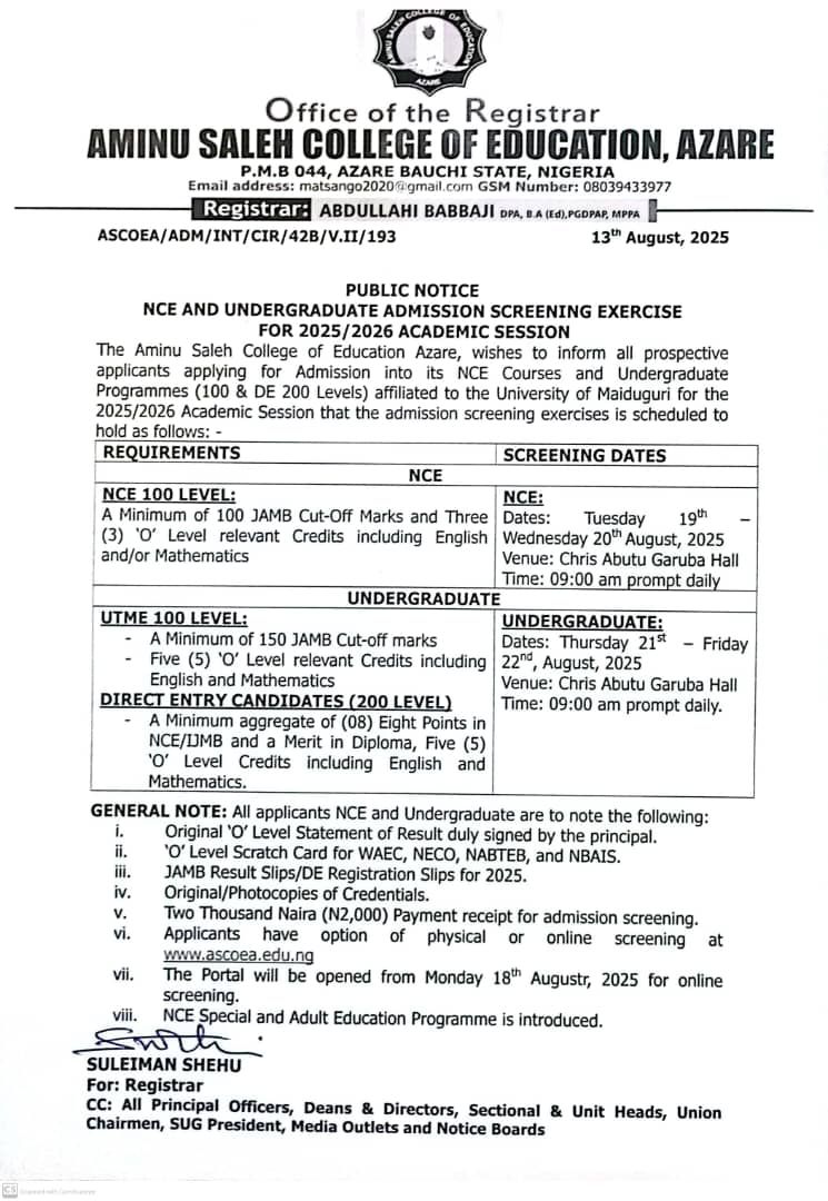 The management of Aminu Saleh College of Education, Azare (ASCOEA) has released the schedule for the NCE and Undergraduate Admission Screening Exercises for the 2025/2026 academic session, including programmes affiliated with the University of Maiduguri.