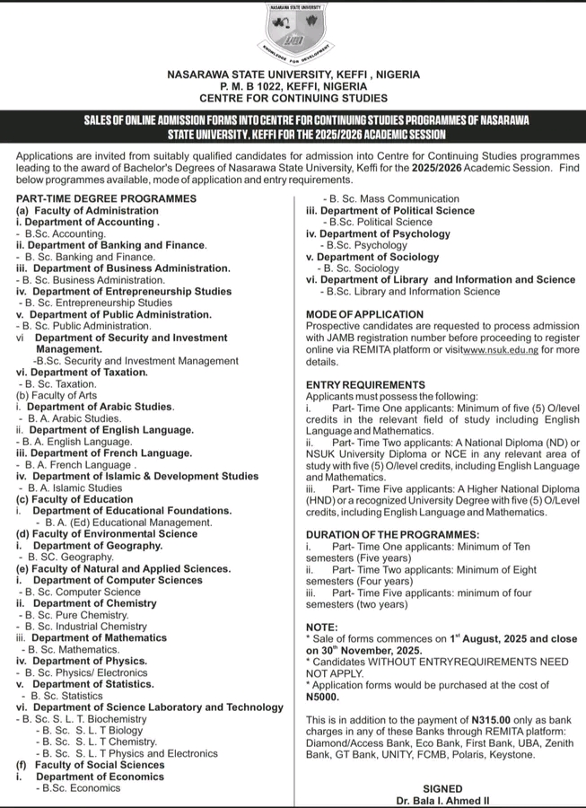 The Nasarawa State University, Keffi is pleased to announce to the general public that the Centre for Continuing Studies CCS has commenced the sale of online admission forms for Part-Time programmes for 2025/2026 academic session.