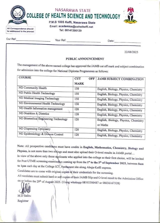 The Nasarawa State College of Health Science and Technology, Keffi has officially announced admission into its various National Diploma (ND) programmes for the 2025/2026 academic session.