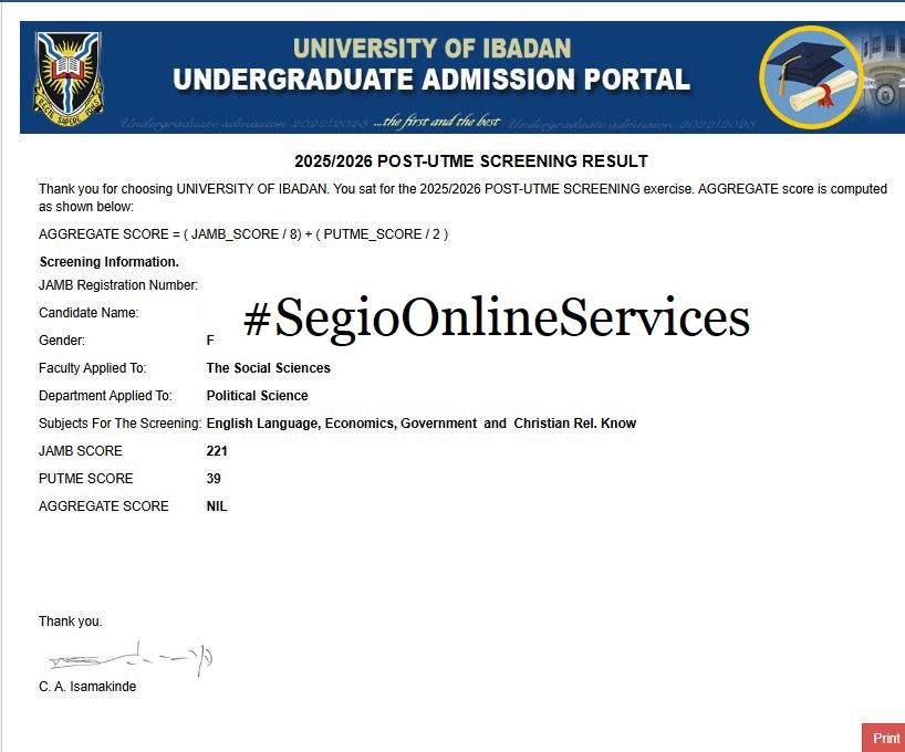 Segio Campus Reports can confirm that the University of Ibadan (UI) has released the results of its Post-Unified Tertiary Matriculation Examination (Post-UTME) for the 2025/2026 academic session.