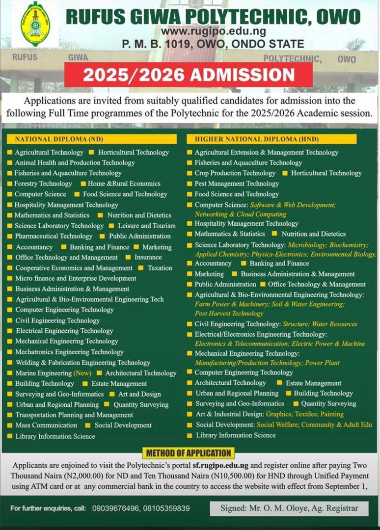 RUFUS GIWA POLYTECHNIC (RUGIPO) RELEASES ND/HND ADMISSION FORM FOR THE 2025/2026 ACADEMIC SESSION