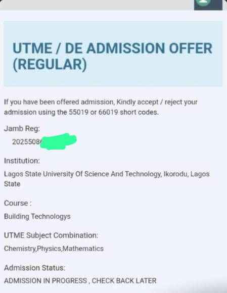Acceptance or Rejection of admission on JAMB Caps will be done via SMS via 66019 or 55019.
