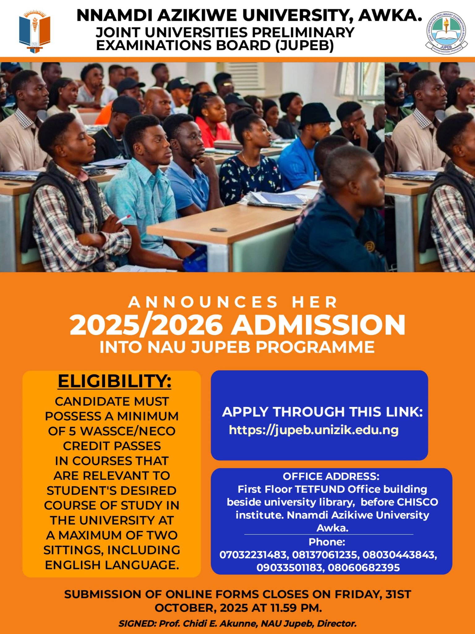 Applications are hereby invited from suitably qualified candidates for admission into the Joint Universities Preliminary Examinations Board (JUPEB) Programme for 2025/2026 session at Nnamdi Azikiwe University