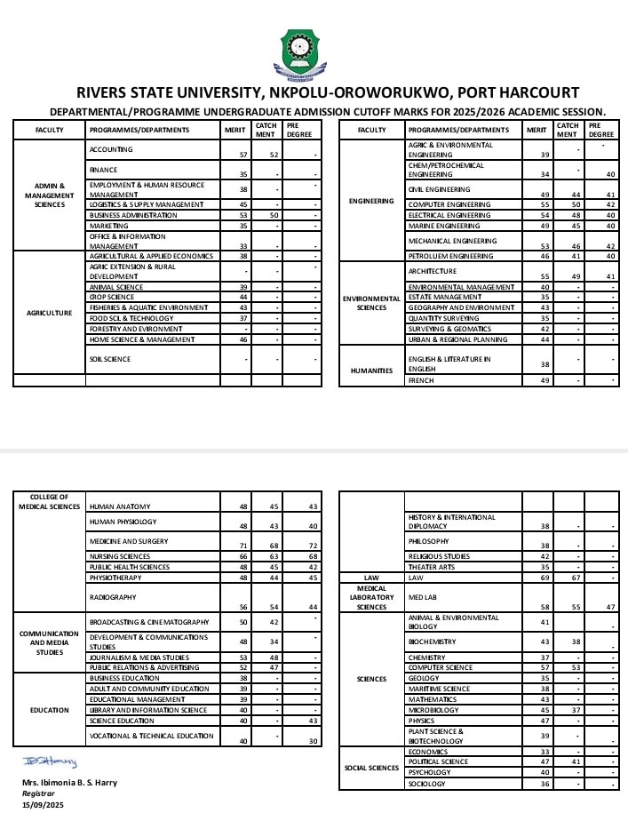 RIVERS STATE UNIVERSITY (RSU) RELEASES APPROVED ADMISSION CUT-OFF MARKS FOR THE 2025/2026 ACADEMIC SESSION