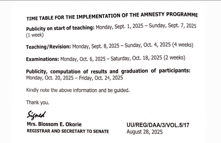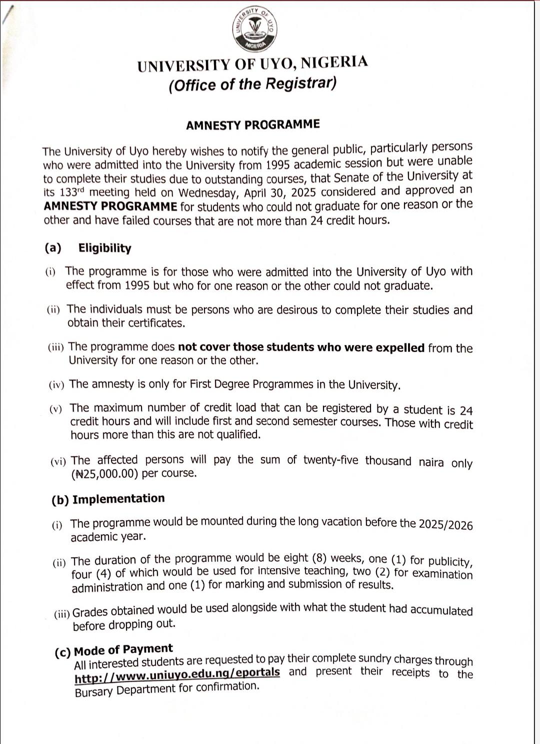 UNIVERSITY OF UYO (UNIUYO) RELEASES JUPEB PROGRAMME ENTRANCE EXAM DATE FOR THE 2025/2026 ACADEMIC SESSION 2025/2026 Basic Studies CBT Screening Exercise The University of Uyo School of Basic Studies Online (CBT) Screening Exercise will […]