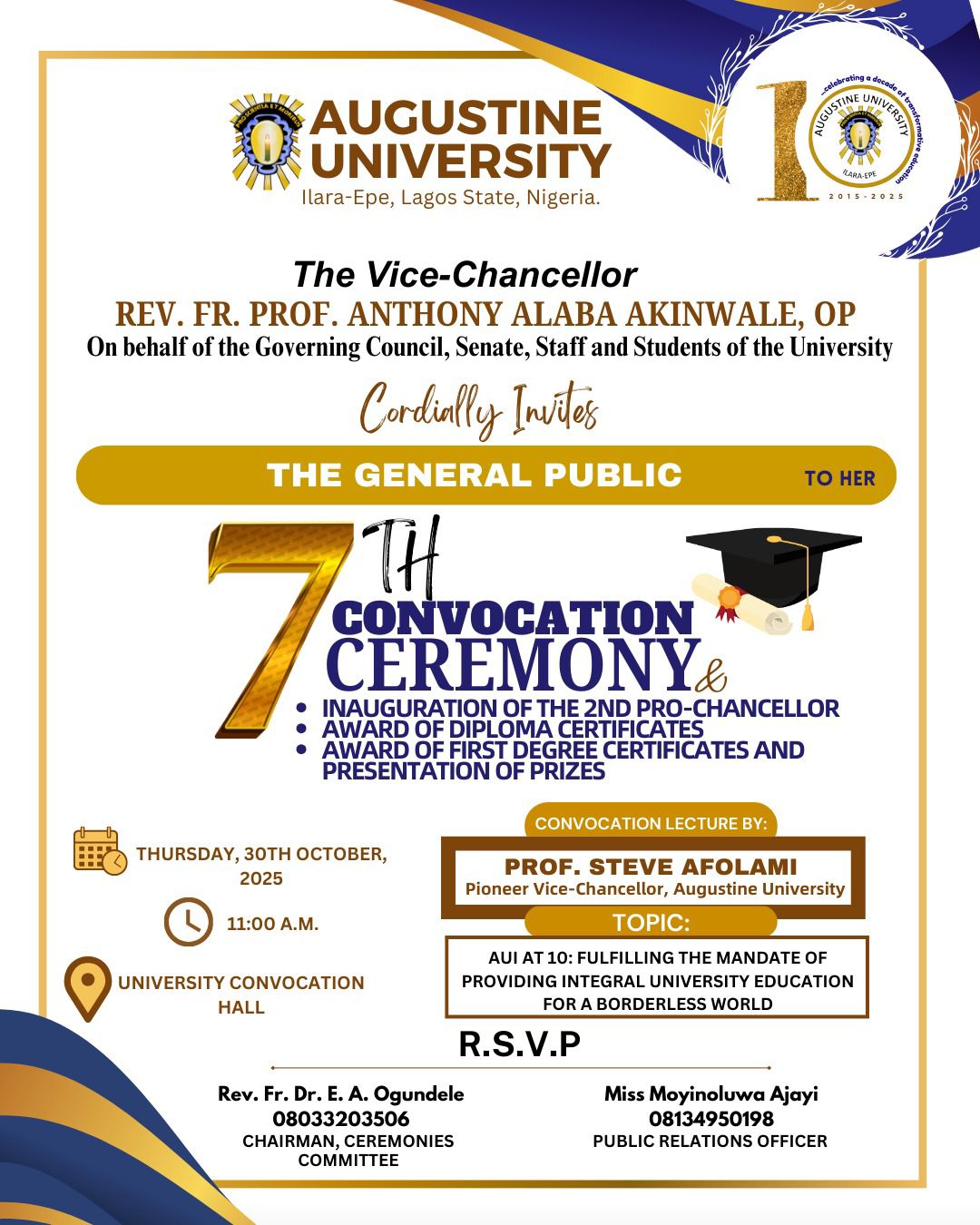 Augustine University, Ilara-Epe, Lagos State, has announced the date for its 7th Convocation Ceremony. The event is scheduled to take place on Thursday, 30th October 2025, at 11:00 a.m. in the University Convocation Hall.