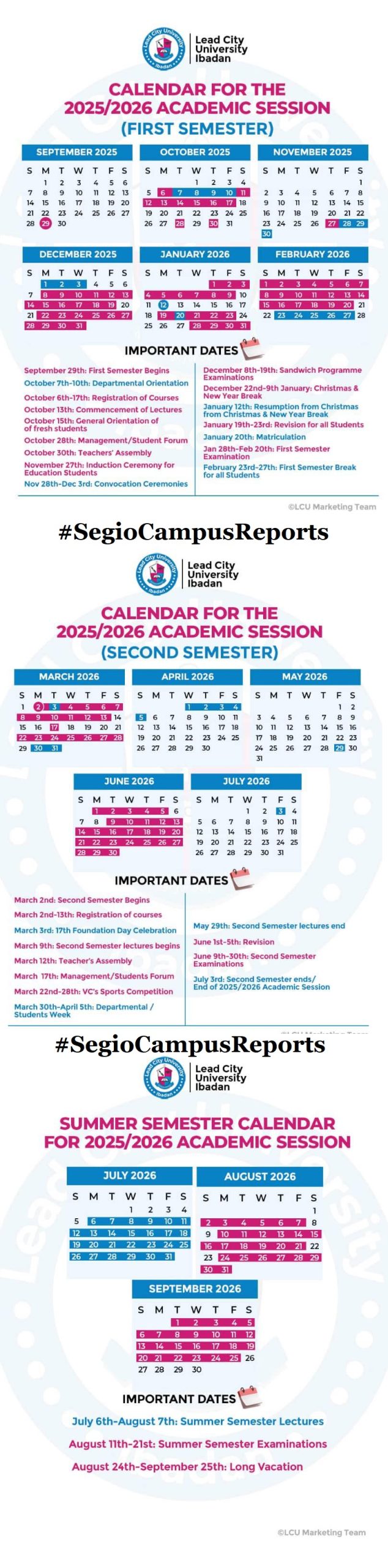 LEAD CITY UNIVERSITY (LCU) RELEASES APPROVED ACADEMIC CALENDAR FOR THE 2024/2025 ACADEMIC SESSION JOIN THE SEGIO ONLINE SERVICES OFFICIAL NEWSROOM AND STAY UPDATED REAL-TIME WITH VERFIED EDUCATIONAL NEWS