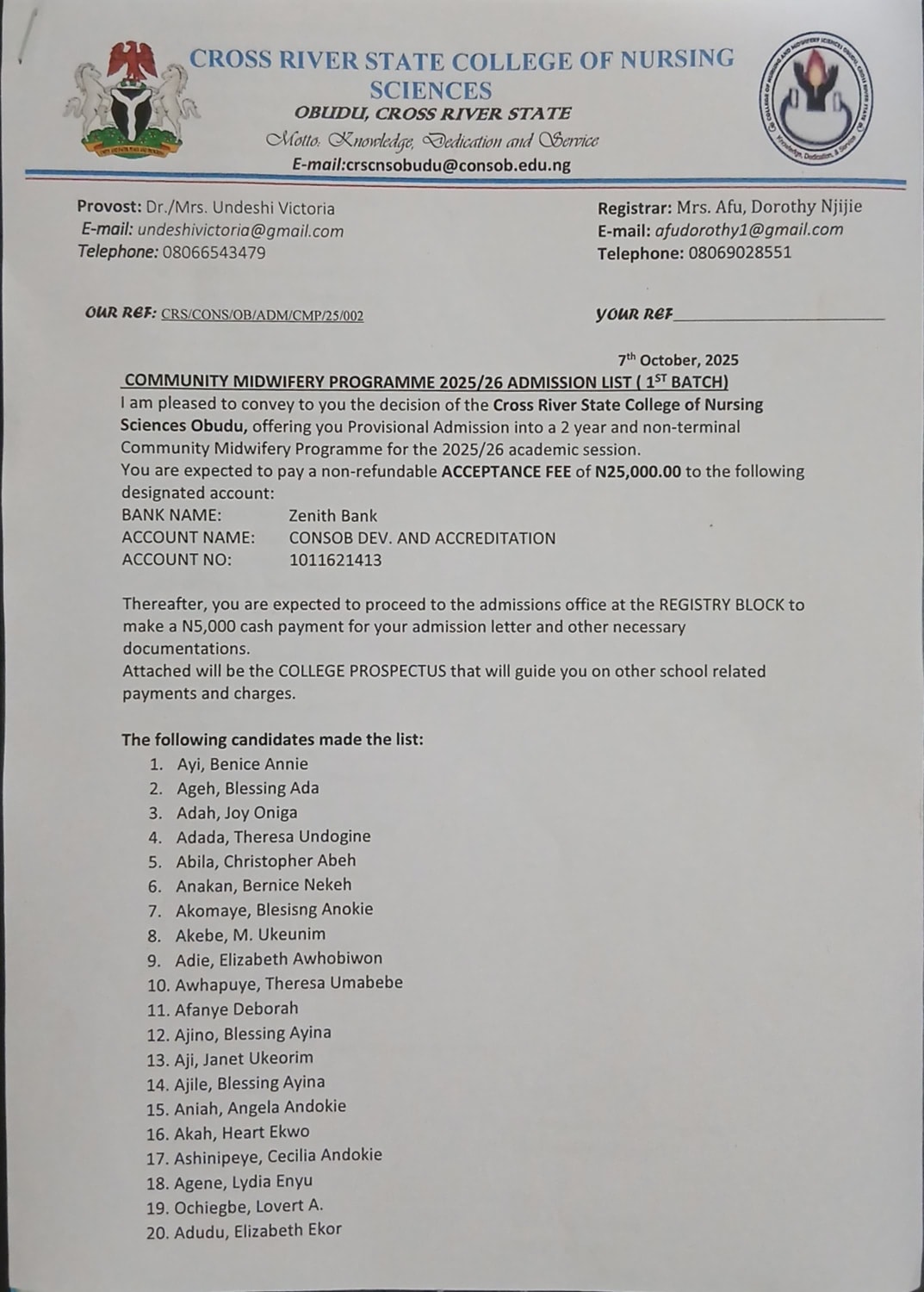 CROSS RIVER STATE COLLEGE OF NURSING SCIENCES OBUDU RELEASES COMMUNITY MIDWIFERY PROGRAMME ADMISSION LIST FOR THE 2025/2026 ACADEMIC SESSION