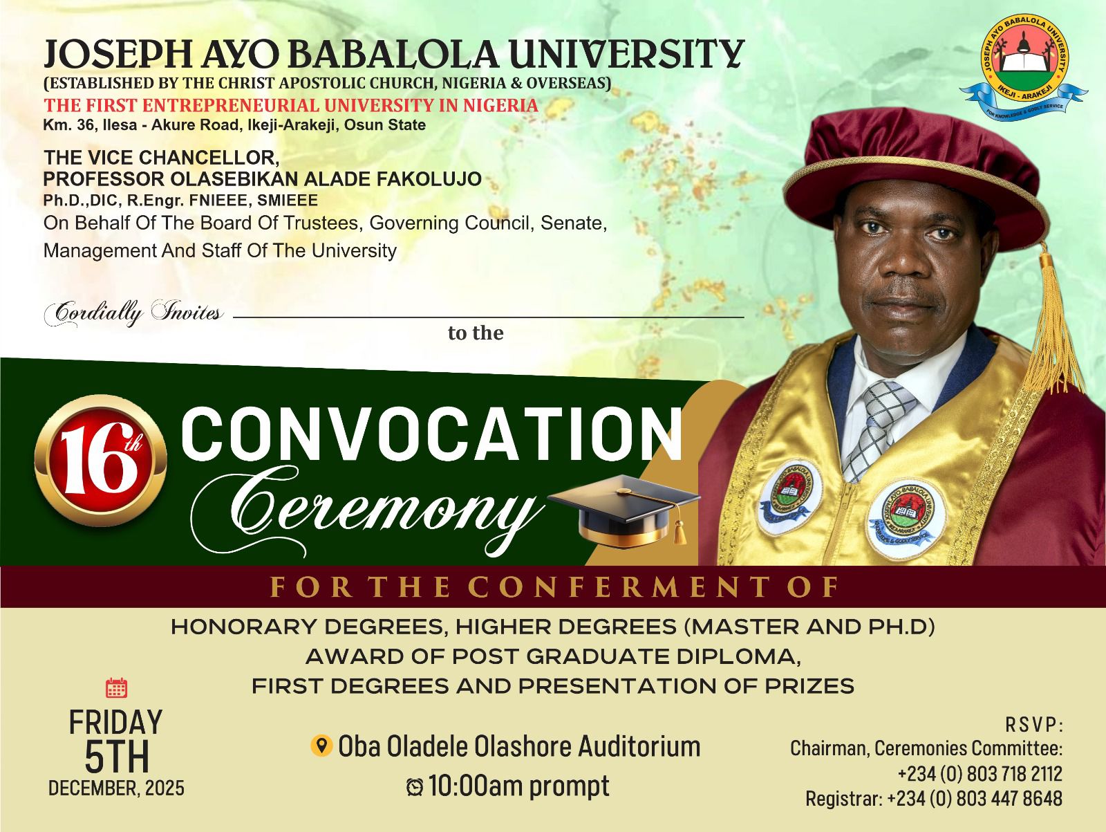 Joseph Ayo Babalola University (JABU), the institution proudly recognised as The First Entrepreneurial University in Nigeria, has announced the date for its 16th Convocation Ceremony, an event set to celebrate academic excellence and honour distinguished personalities.