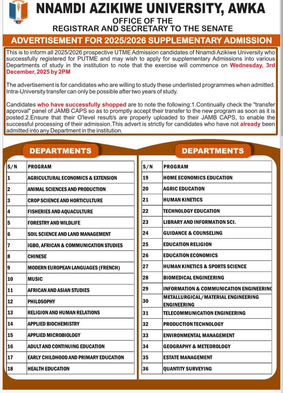 Nnamdi Azikiwe University, Awka, through the Office of the Registrar and Secretary to the Senate, has announced the commencement of the supplementary admission exercise for the 2025/2026 academic session.